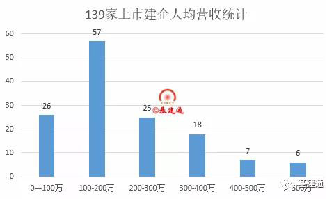 上表是六大建筑央企的人均營收榜,中國交建以人均超400萬成為榜首,充分展現了企業的管理效率。但是這個只是幾家建筑央企的對比,那么這幾家央企在整個建筑業里面是什么個情況呢?我們統計了139家上市建企的相關數據。300萬是一條分界線