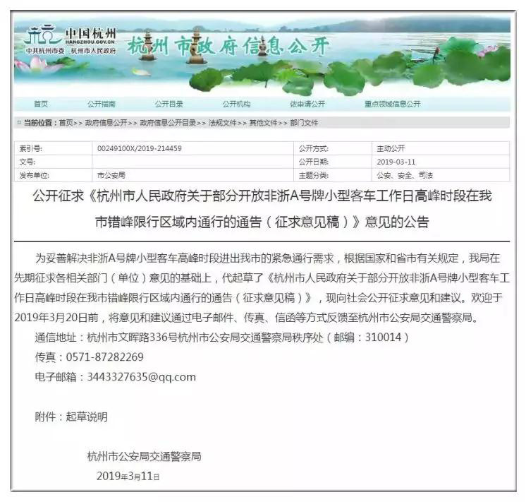 3月11日,杭州市政府網(wǎng)站發(fā)布了《杭州市人民政府關(guān)于部分開放非浙A號牌小型客車工作日高峰時段在我市錯峰限行區(qū)域內(nèi)通行的通告(征求意見稿)》。