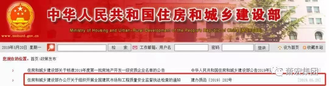 2019年5月20日住建部官網發布《關于組織開展全國建筑市場和工程質量安全監督執法檢查的通知》,決定在全國統籌開展建筑市場和工程質量安全監督執法檢查: